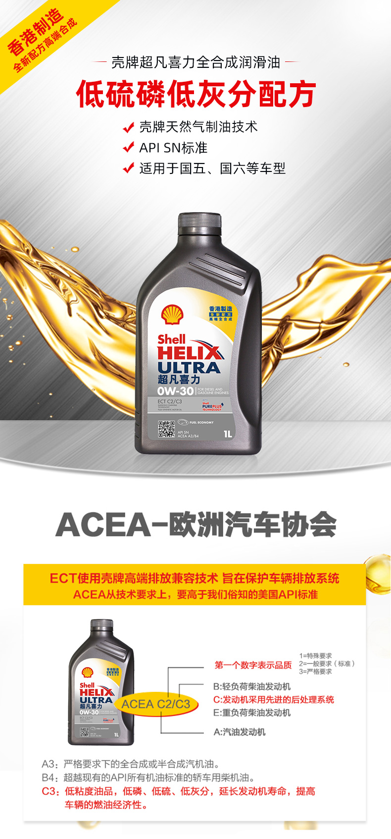 【自营】香港壳牌超凡灰喜力0W-30 1L 灰壳 SN汽车全合成机油国六